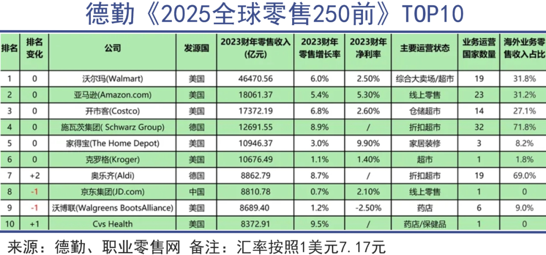 渠道的强大,是国家经济、市场是否强势的关键指标。德勤发布的《2025全球零售250强》,几乎被欧美巨头把控,很难看到新兴经济体国家的影子,中国共有14家企业上榜。而前十名中仅有京东一家,其余均为美国和德国企业。