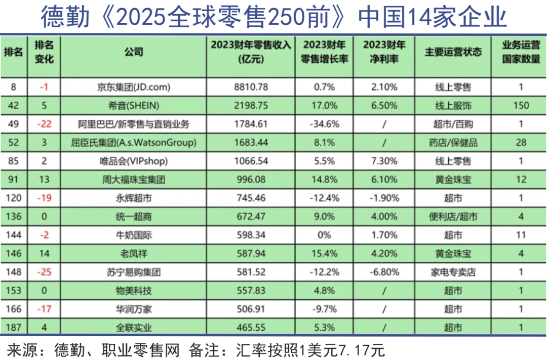仔细来看,上榜的中国企业基本为电商、商超百货或黄金珠宝专卖店,仅有屈臣氏为化妆品/保健品零售商,苏宁易购为家电专卖店,其他领域规模性企业寥寥。