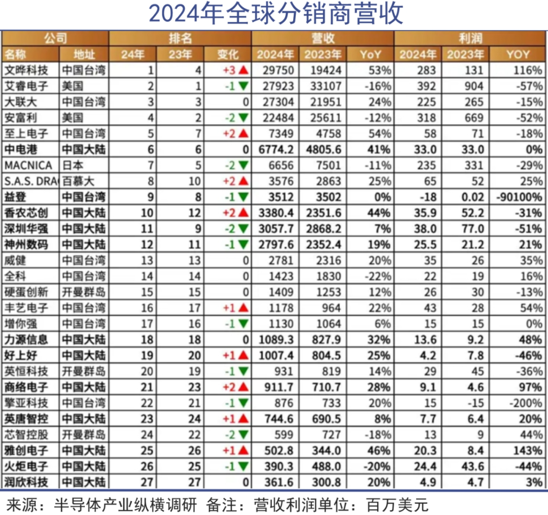 得益于AI、消费电子等行业的需求拉动,我国半导体分销产业方兴未艾。台湾文晔于2024年4月完成收购Future,业绩大幅增长,一举反超艾睿电子登顶全球首位。