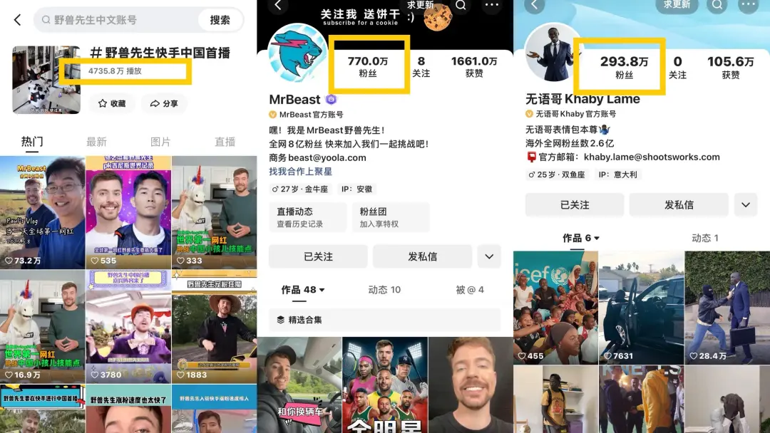 7月底,YouTube顶流网红“野兽先生”(MrBeast)在快手开启直播首秀,与此同时,另一位热门网红“无语哥”(Khaby Lame)也官宣入驻了国内社交平台,并计划启动中国行。