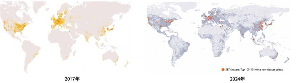 2017和2024年全球百大科技集群分布。中国头部科技集群的增加不仅是数量的增加,还是覆盖中西部和东北地区的全方位增加。 WIPO