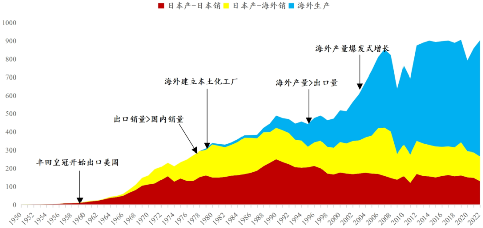 以丰田汽车为例,当其在日本本土产量趋于稳定的1980年,正值日系车在美市场份额突破20%,远高于如今中国汽车份额。即使这样,仍在未来四十年迎来爆发式增长 丰田汽车官网,招商银行研究院