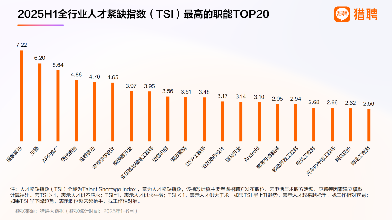 2025年半年全行业人才紧缺指数(TSI)TOP20榜单显示,高科技领域人才供需矛盾尤为突出。值得注意的是,搜索算法工程师和主播两类岗位高居紧缺指数前两位,均超过6(TSI>1表示人才供不应求),凸显出数字经济时代下流量变现能力的核心价值。这折射出当前商业生态的深刻变革:一方面,直播带货已成为各行业标配的营销渠道,具备专业素养和流量号召力的主播成为稀缺资源;另一方面,在信息过载的背景下,精准推送算法直接决定了内容触达效率,这使得搜索算法人才成为企业竞相争夺的对象。两类岗位的持续走俏印证了“流量即商业”的现代营销法则,也预示着数字营销领域的人才争夺战将愈演愈烈。