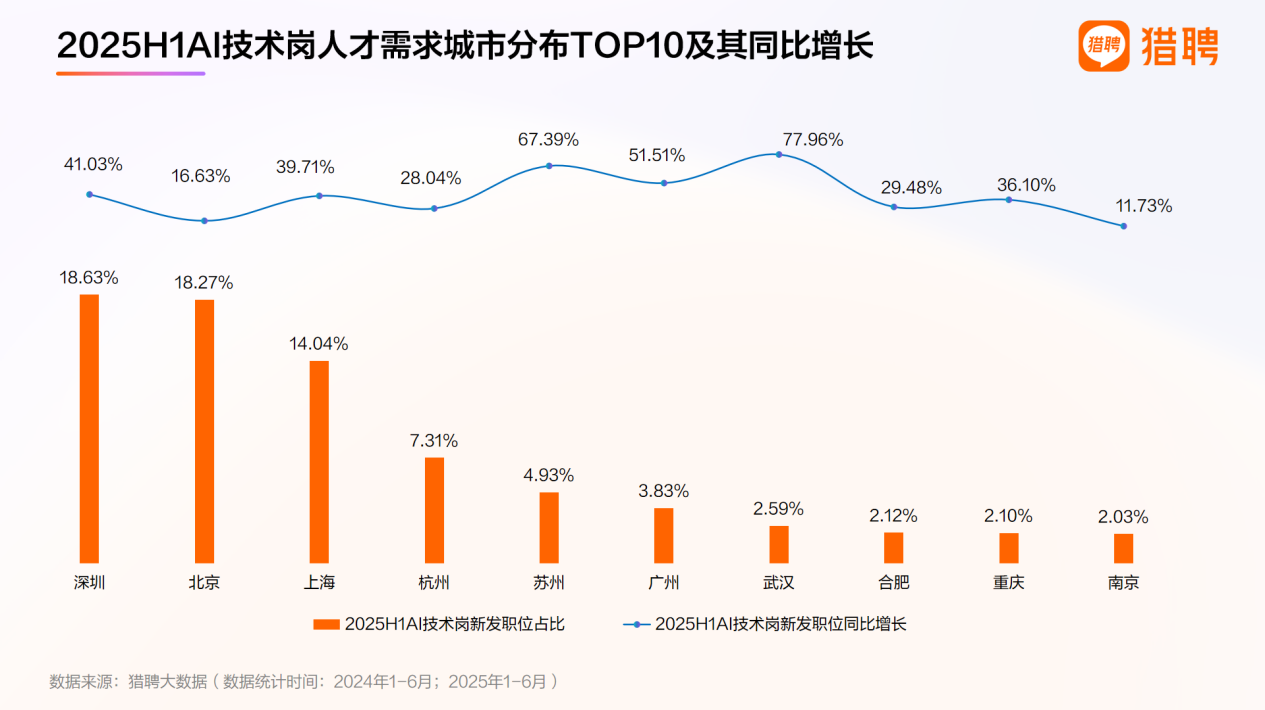 2)深圳北京上海AI技术岗占据半壁江山,武汉苏州AI技术岗增速最快