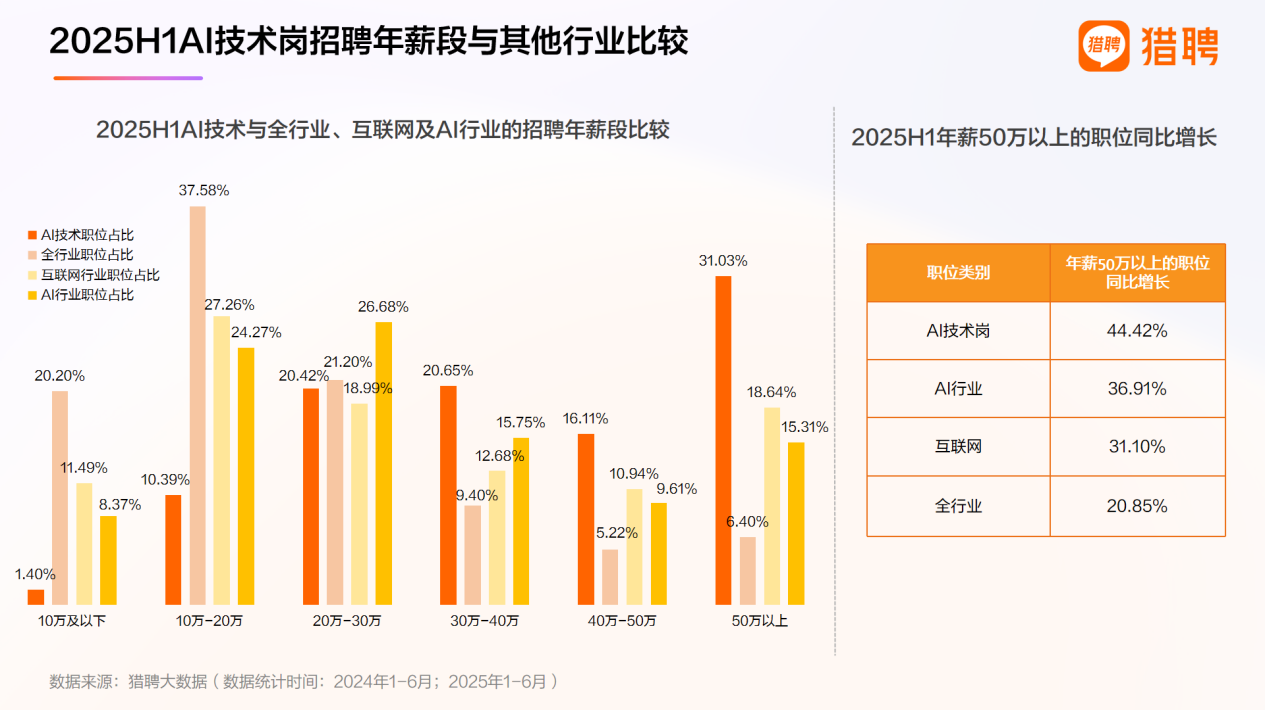 猎聘大数据显示,50万年薪以上的AI技术岗占比高达31.03%,远超全行业(6.40%)、互联网行业(18.64%)和AI行业整体(15.31%)的水平。从增速来看,2025上半年AI技术岗50万年薪以上职位同比增长达44.42%,显著高于互联网行业(刚突破30%)和AI行业整体(36.91%)的增速。这充分印证了AI技术岗位的市场稀缺性和高含金量,使其成为企业竞相争夺的核心人才资源。