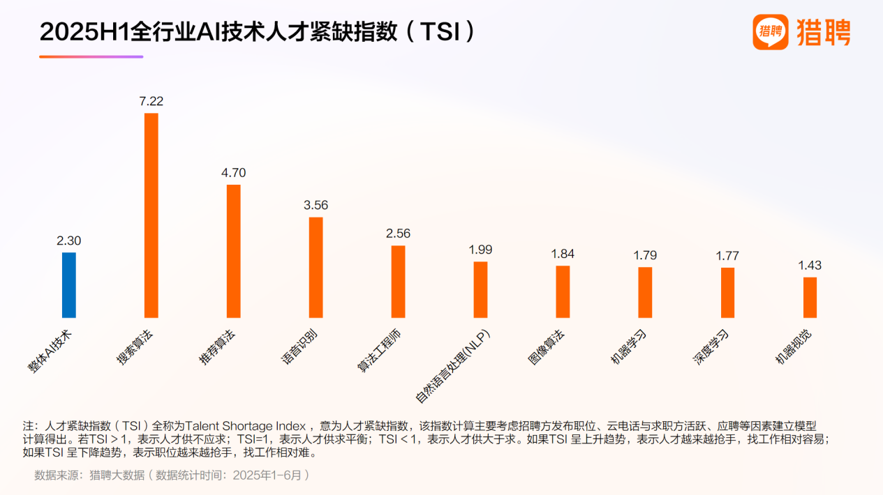当前国内AI人才缺口已突破500万,其中技术类人才尤为紧缺。2025上半年数据显示,AI技术人才整体紧缺指数(TSI)达2.30(TSI>1即表示人才供不应求),处于高度供不应求状态。细分类别中,搜索算法(TSI 7.22)和推荐算法(4.70)人才缺口最为突出,语音识别和算法工程师(均超2.5)紧随其后。图像算法、机器学习、NLP、深度学习和机器视觉等方向(TSI均超1.4)同样面临人才短缺,可见AI产业各技术环节对专业人才的持续渴求。
