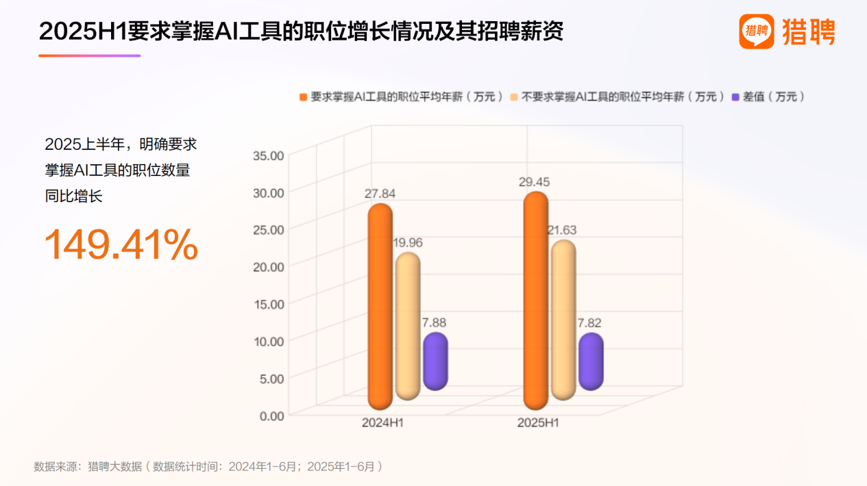 AI技术的蓬勃发展正在重塑就业市场格局。2025上半年,明确要求掌握AI工具的职位数量同比激增149.41%,反映出企业对AI应用能力的重视已从技术岗位扩展到更广泛的职能领域。薪酬数据进一步印证了这一趋势:2024上半年和2025上半年,要求AI技能的岗位招聘平均年薪(27.84万、29.45万)持续领先无AI技能要求的岗位约7.8万元,凸显AI能力已成为职场竞争力的重要溢价因素。这种“AI+”的薪酬溢价现象,既体现了技术变革带来的价值重估,也预示着AI素养正逐步成为现代职场的基础能力要求。