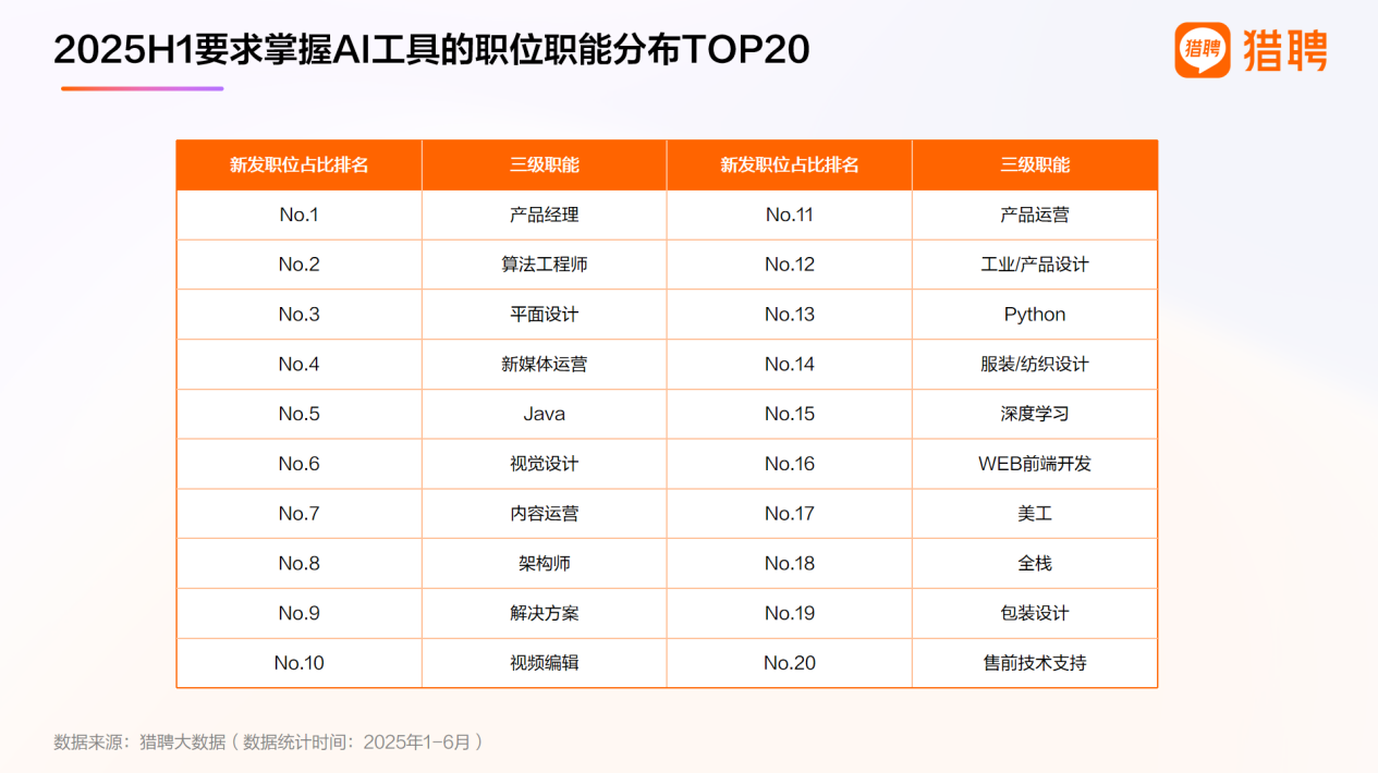 2、要求掌握AI的职位职能分布TOP20:产品经理居首,技术及设计类职位上榜较多