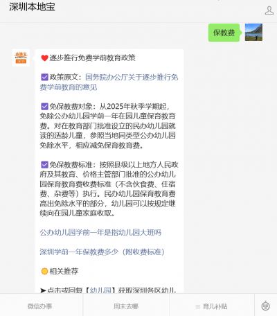 📜 获取详情:公众可通过微信搜索公众号“深圳本地宝”,并回复“保教费”来获取该政策的全文内容、实施时间、受益儿童范围以及预期的经济节省等详细信息。