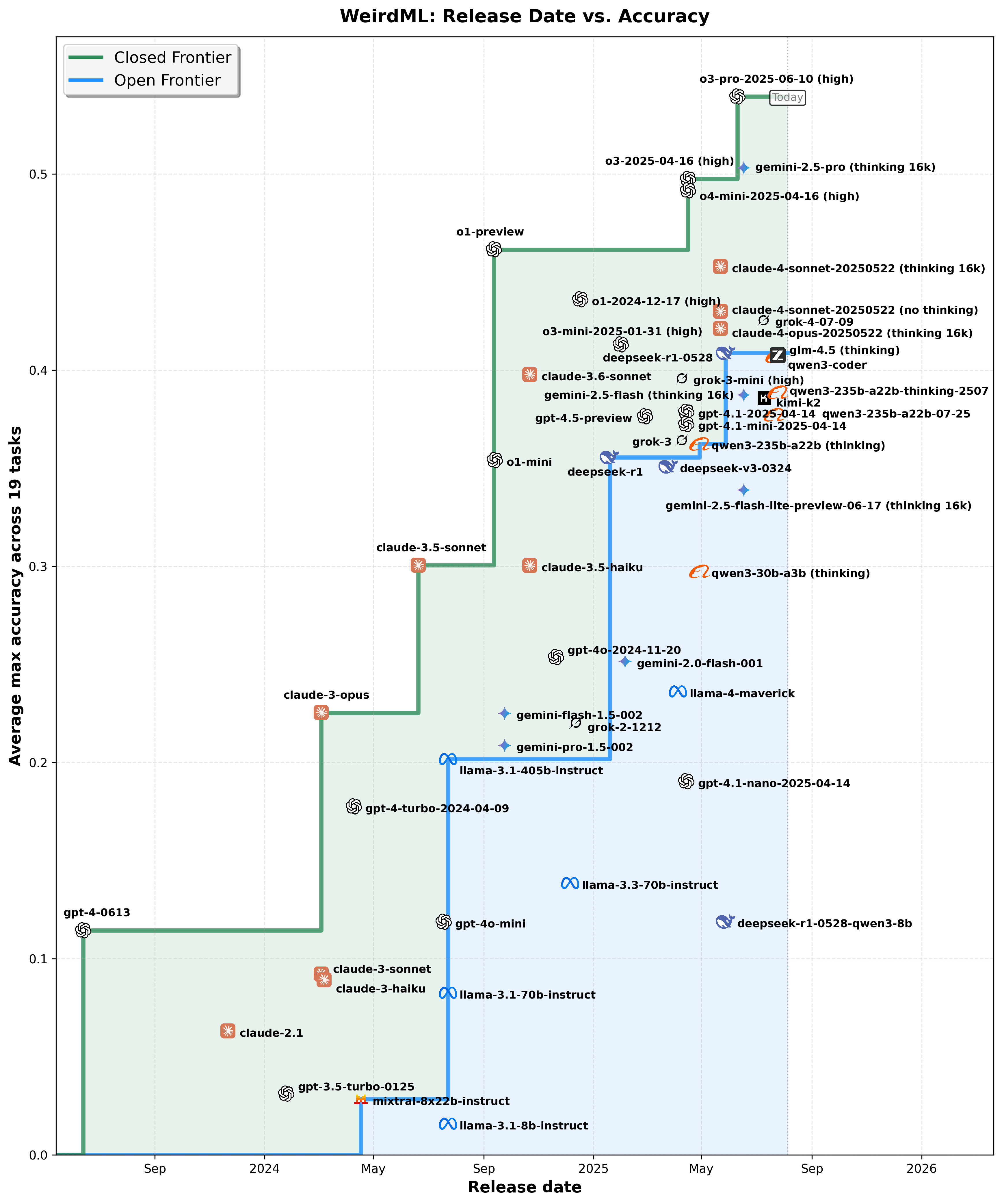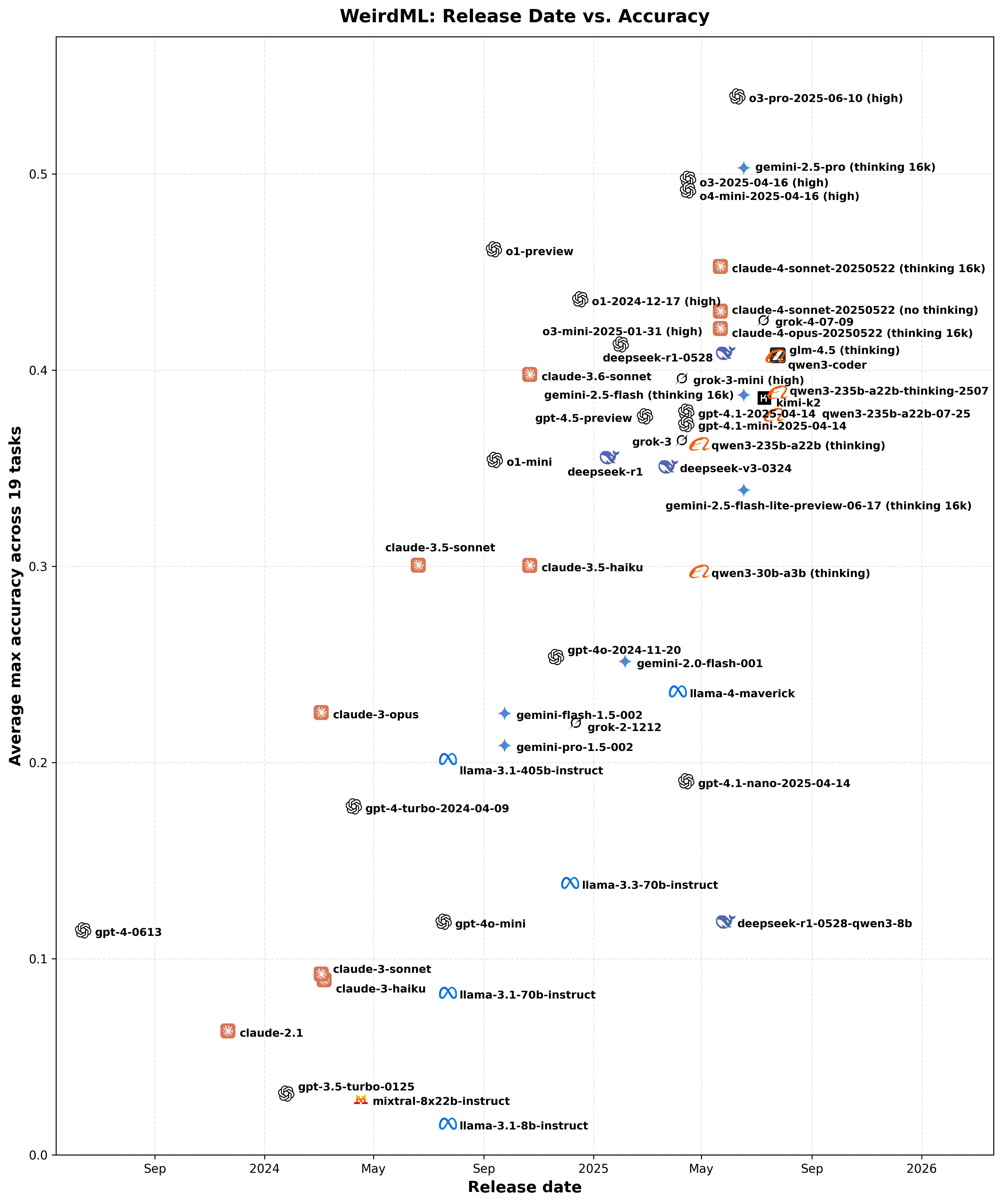 WeirdML is a benchmark challenging LLMs to solve a set of weird and unusual machine learning tasks designed to require careful thinking and understanding of the data and its properties. We have recently run all the major historical models we could find, going back to GPT-4 in June 2023[1], to study the evolution of these hard coding capabilities over time.