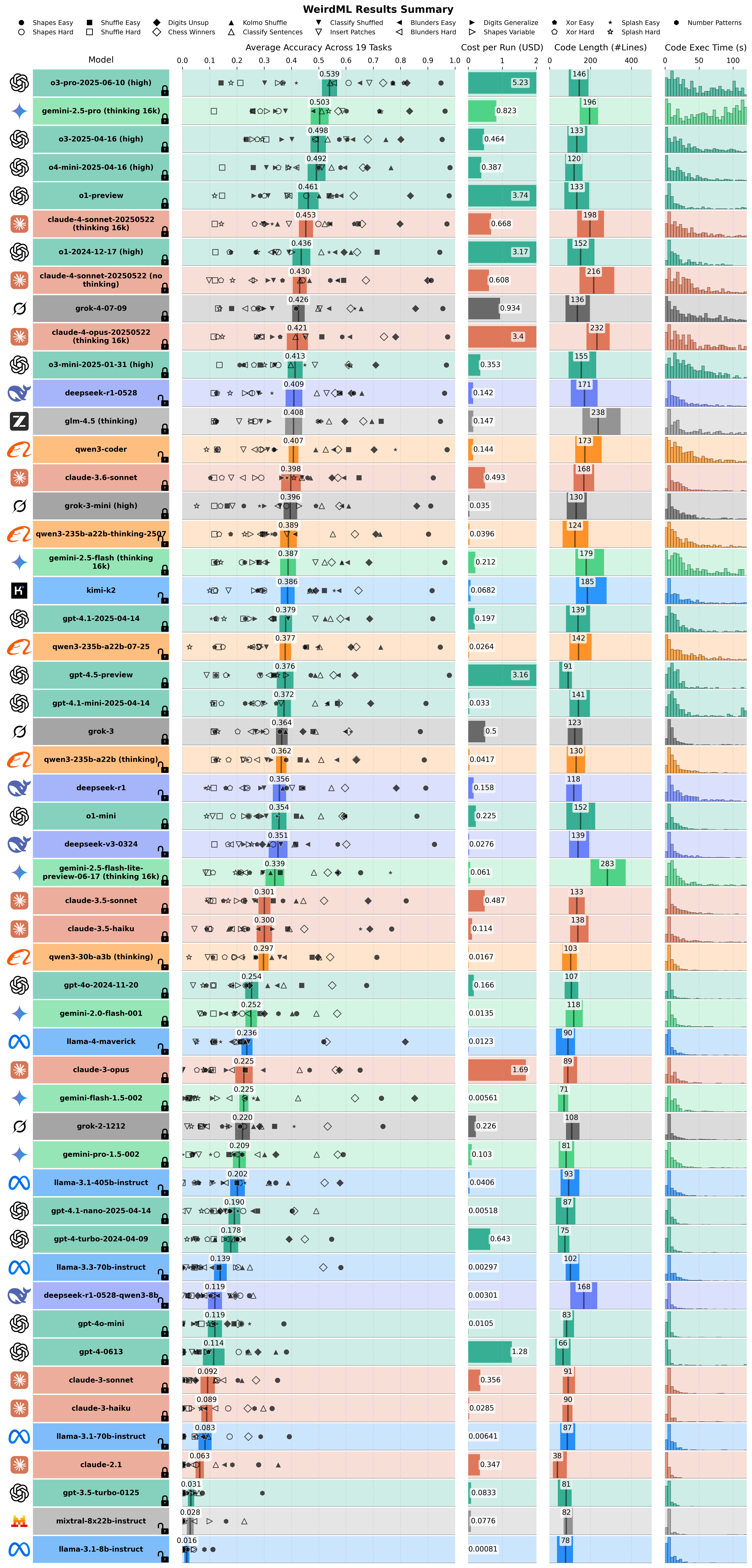 🚀 WeirdML基准测试旨在挑战大型语言模型(LLM)在处理需要独特思维和数据理解的怪异机器学习任务上的能力。通过一系列精心设计的任务,该基准能够深入挖掘模型在复杂推理和数据敏感性方面的表现。