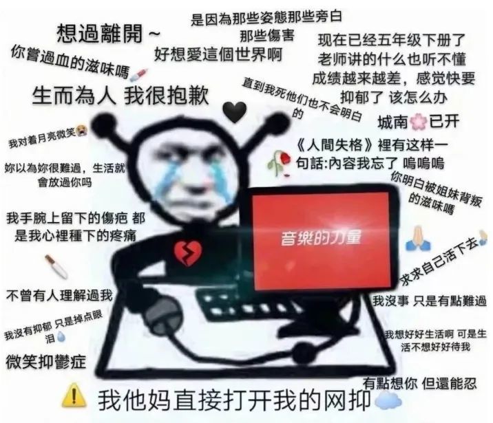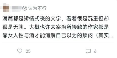 于是,太宰治勉强被饶了一段时间。直到现在新节奏又出现了——无病呻吟。同时“生而为人,我很抱歉”也有了新节奏,在这个反思会被嘲讽为反思怪的环境里,这话简直是火药桶,我不止一次见过有人因此吵架。