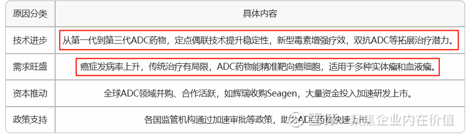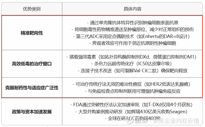 ADC药物的核心优势在于其“生物导弹”式的设计,结合了靶向治疗的精准性与化疗药物的强效杀伤力,同时受益于技术进步与外部资源支持,正在重塑癌症治疗格局。
