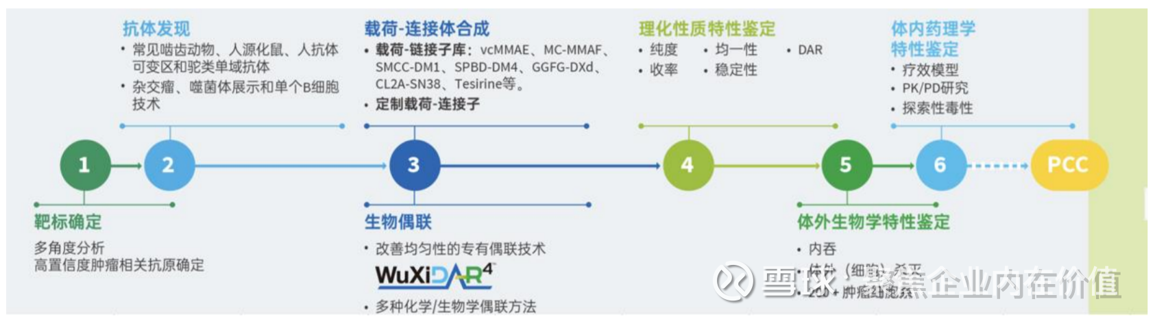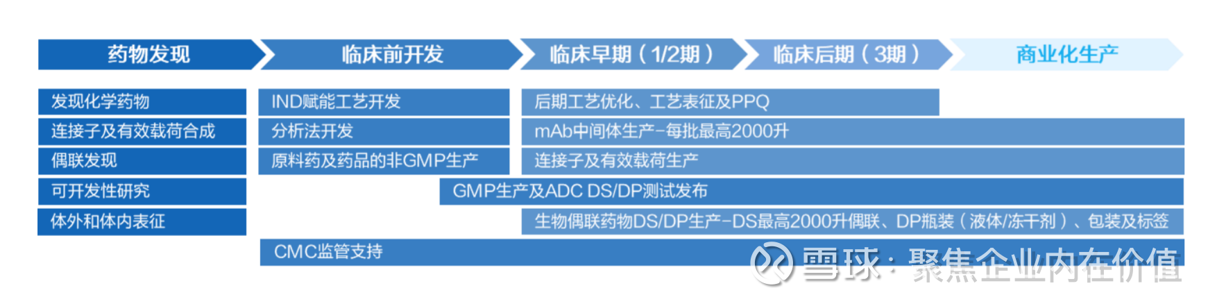 13.同一园区一站式开发和生产,高效完成后期工艺开发到 BLA。在 ADC 后期开发阶段,需同时进 行四个组件的 PPQ(生产工艺验证),过程非常复杂且耗时。目前,无锡基地已实现 200 米同一 园区“一站式端到端”生产,全面覆盖抗体中间体、载体-连接子、ADC 原液及制剂四大 ADC 核 心生产板块,大大降低风险、成本和时间,使得后期开发到 BLA(生物制品许可申请)提交可在 24~36 个月内高效完成。