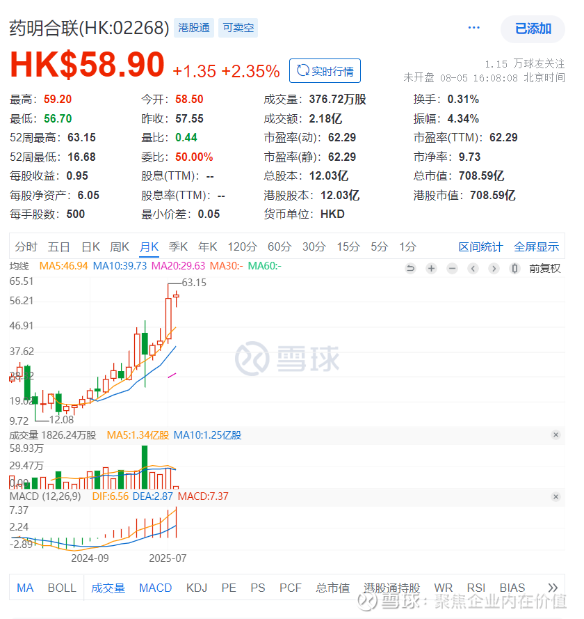 股价是58.90港币,市净率9.73倍,市值708.59亿港币。