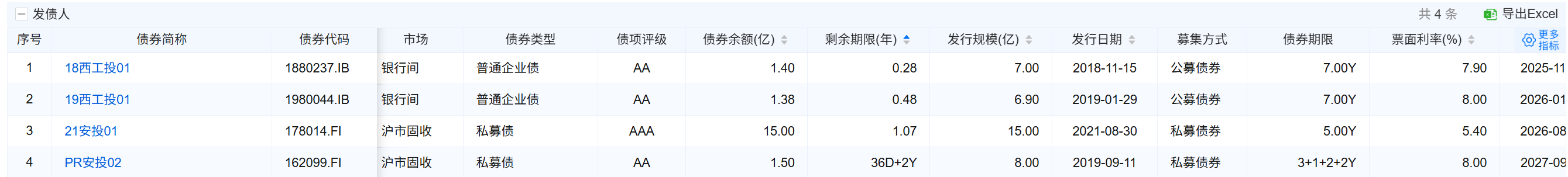 截至目前,安顺西秀工投有存续债券4只,存量规模19.28亿元,其中“18西工投01”将于2025年11月15日到期,余额1.40亿元,票面利率7.90%。