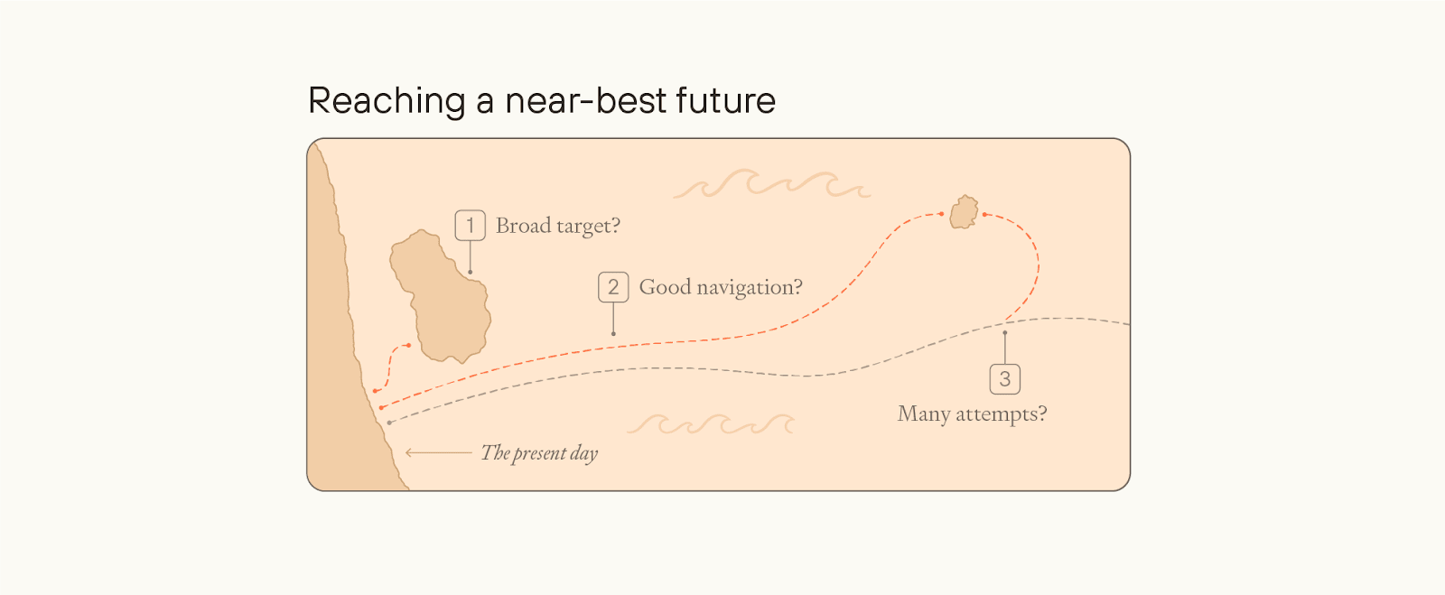 In No Easy Eutopia, we focus on the first of these. (The next essay, Convergence and Compromise, will focus on the next two.) We argue there are many ways in which future society could miss out on most value, or even end up dystopian - many of which are quite subtle. The “target” of a near-best future is very narrow: very unlikely to happen by default, without some beings in the future trying hard to figure out what’s best, and actively trying to make the world as good as possible, whatever “goodness” consists of.