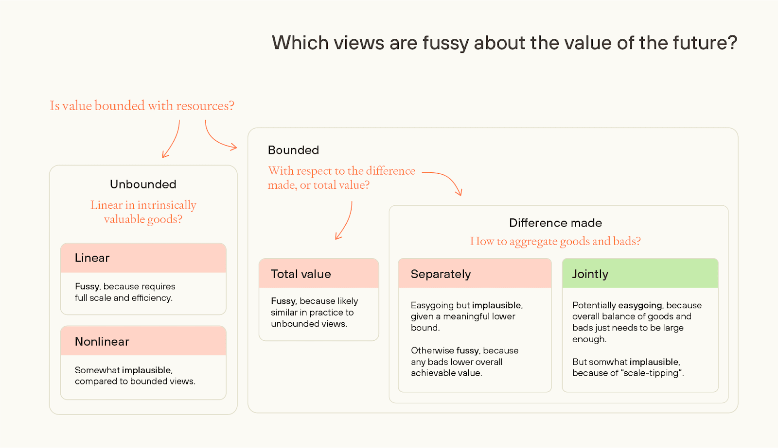 Some ways of valuing futures make it look comparatively easy to reach eutopia, because they regard a wide range of futures as close in value to the best feasible future. We’ll call these views easygoing. Other views make eutopia look comparatively hard; we’ll call these views fussy.