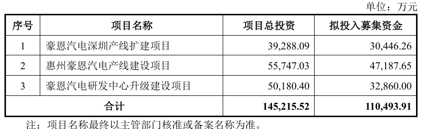 豪恩汽电《2025年度向特定对象发行A股股票预案》显示,公司拟向特定对象发行股票,募集资金不超过11.05亿元。其中,3.04亿元用于豪恩汽电深圳产线扩建,4.72亿元用于惠州豪恩汽电产线建设;3.29亿元用于豪恩汽电研发中心升级建设。项目总投资为14.52亿元。