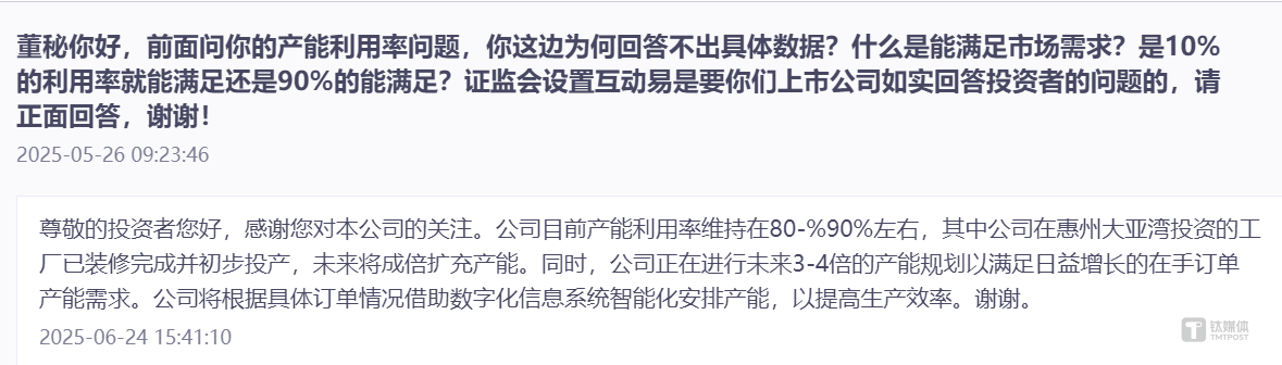 事实上,公司的产能利用率情况,一直是投资者关注的重点。就在两个月前,还有投资者在互动平台上询问公司产能利用率情况。