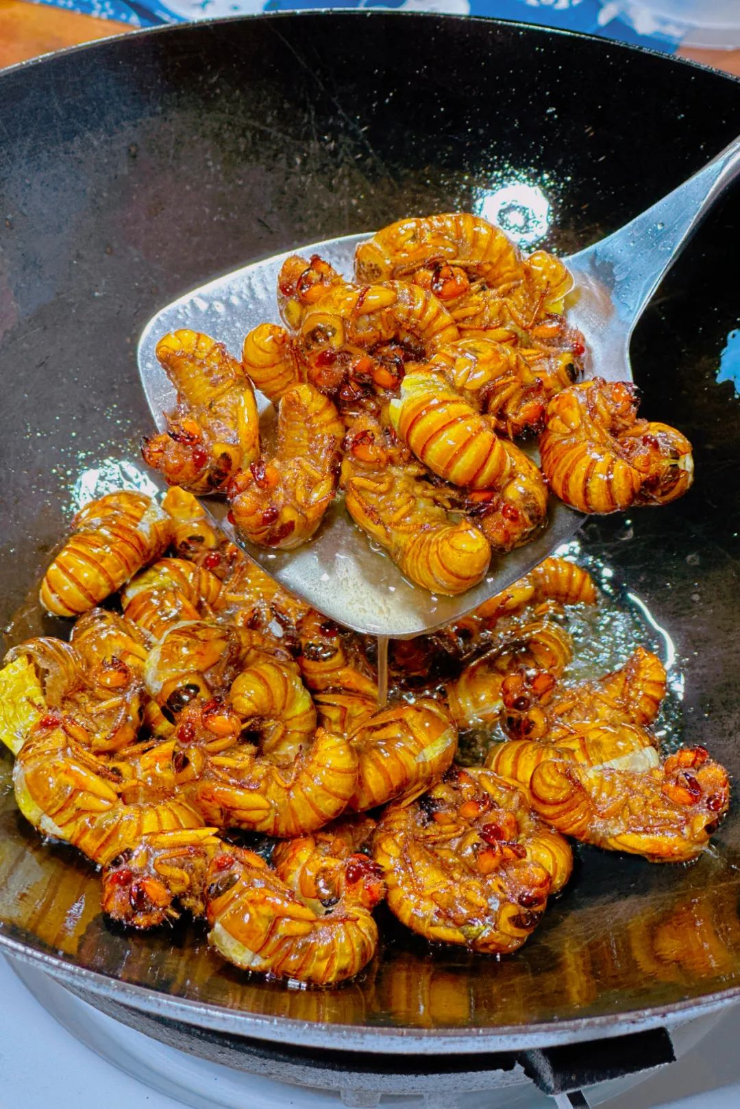 而今天,知了猴在山东最常见的做法,主要是油炸、爆炒和烧烤:盐水浸泡10分钟,七成油温下锅,20秒即撒椒盐出锅,就是一盘油炸知了猴;爆炒做法,则是把炸出锅的知了猴再和辣椒、花椒、姜蒜一起下锅,麻辣下酒;知了猴穿成一串,接受火焰炙烤,更是山东夏夜烧烤摊的必选菜。