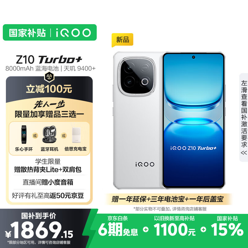 京东 vivo iQOO Z10 Turbo+ 12GB+256GB 云海白 天玑 9400 + 旗舰芯 8000mAh 超薄蓝海电池 国家补贴 电竞手机国补后 1869 元起直达链接更多细节图赏: