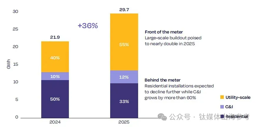 电网侧等大储将引领欧洲储能的新增长。SolarPower Europe更是预测,2025年欧洲储能新增装机总量将达到29.7GWh,同比将实现增长36%,其中,公共事业、工商业、家用等储能市场预计分别同比增长55%、33%、12%。由此可见,以电网为核心的公共机构将爆发出巨大的储能需求。