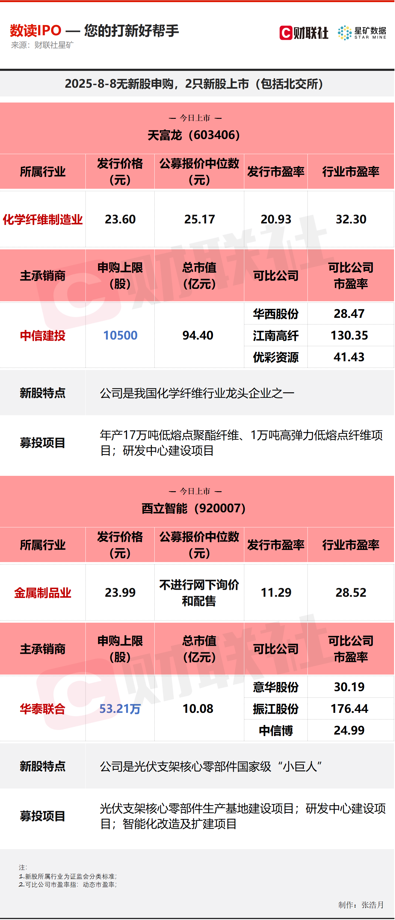财联社8月8日讯,今日无新股申购;有2只新股上市,分别为沪市主板的天富龙,北交所的酉立智能。