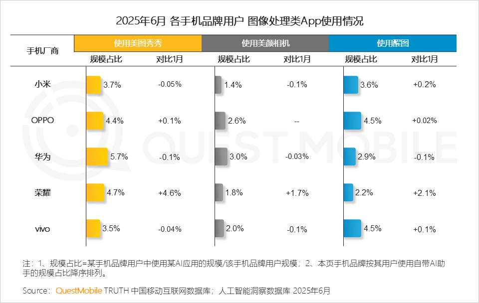 QuestMobile数据显示,2025年6月,美图秀秀旗下AI产品-AI修图月活跃用户规模为100.9万,较1月略微有所下滑。