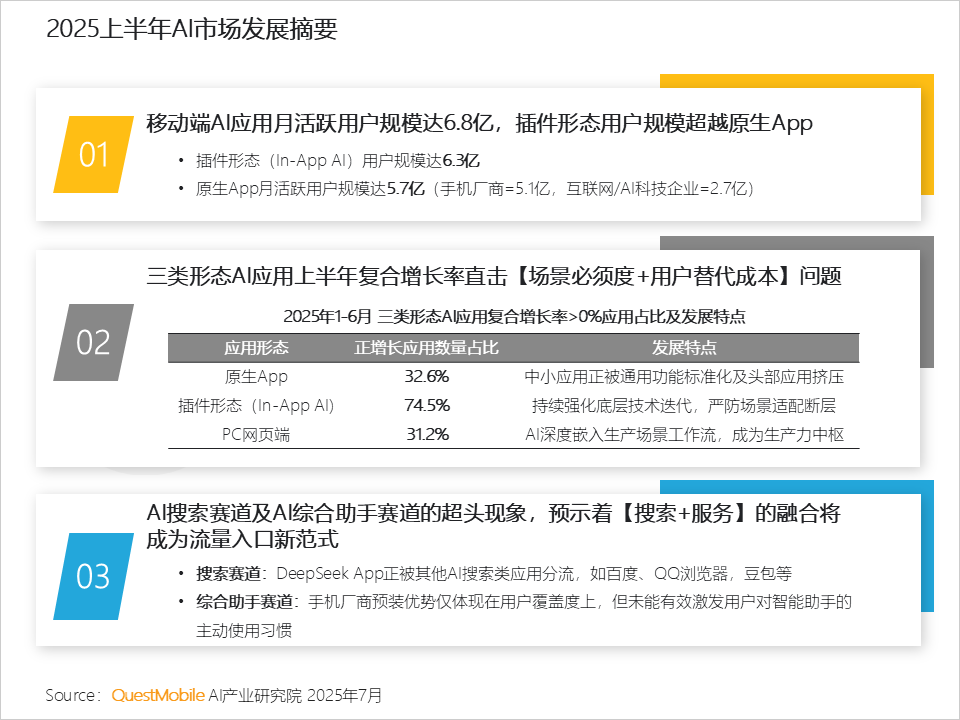 QuestMobile 发布了 2025 年国内 AI 应用的上半年报告,总的来说,相比海外市场 app 和 web 市场都很火热的情况,国内市场的情况差别比较大。