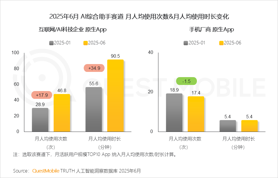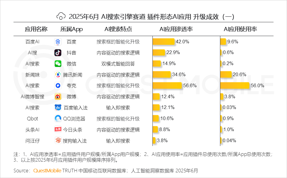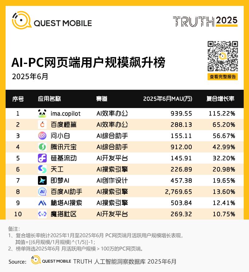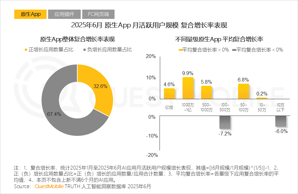 QuestMobile数据显示,腾讯元宝App上半年复合增长率为55.2%,抖音即梦AI达33.4%。