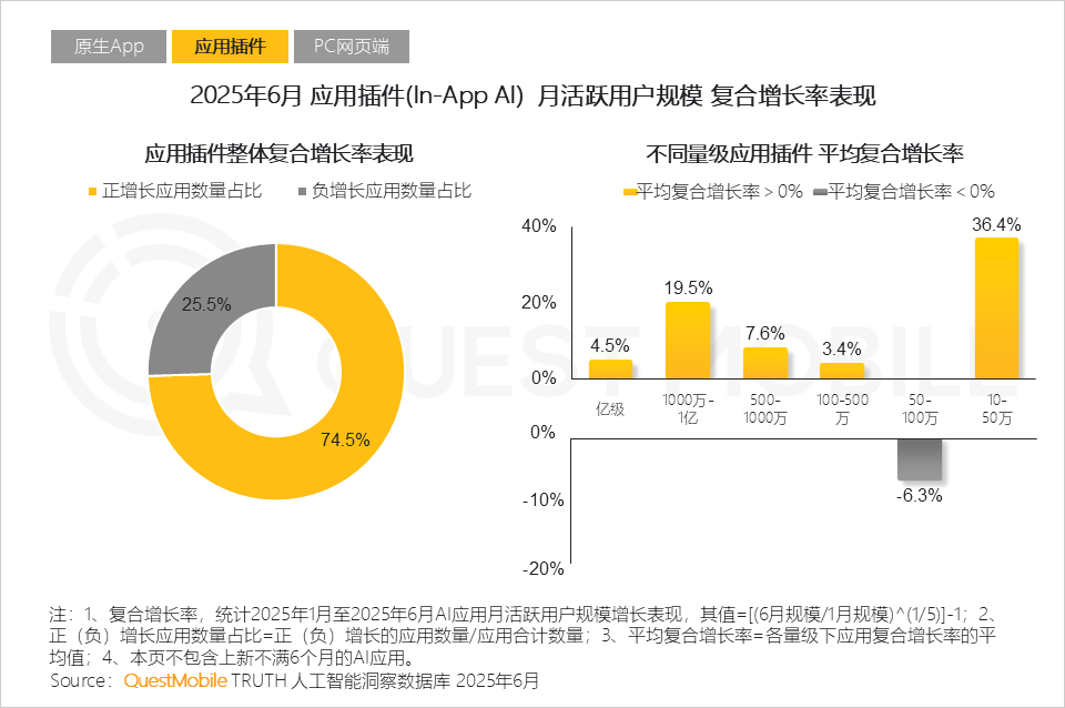 5、74.5%的插件形态应用保持正增长,但明显呈结构分化(不同量级区间增速差异较大),需时刻保持底层能力迭代,同时密切警惕“场景嵌入失效”。