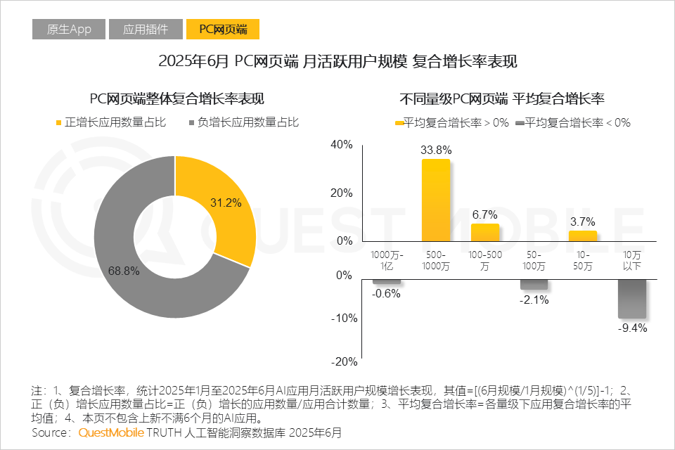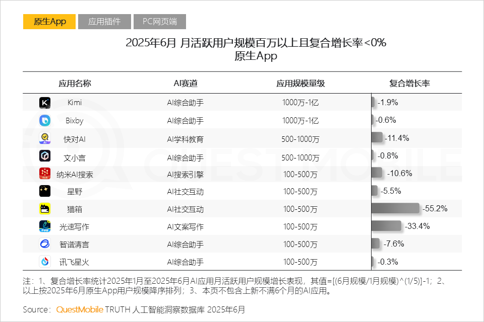 与此相关,PC 网页端玩家早已进入淘汰赛,八成玩家用户量在 50 万以下、68.8%玩家负增长;原生 APP 市场也进入洗牌期,整个上半年,近七成原生 APP 玩家负增长,尤其是手机厂商预装的 AI 手机助手,以及中长尾玩家,在使用场景缺失叠加同质化的问题下,增长乏力……