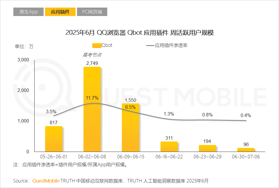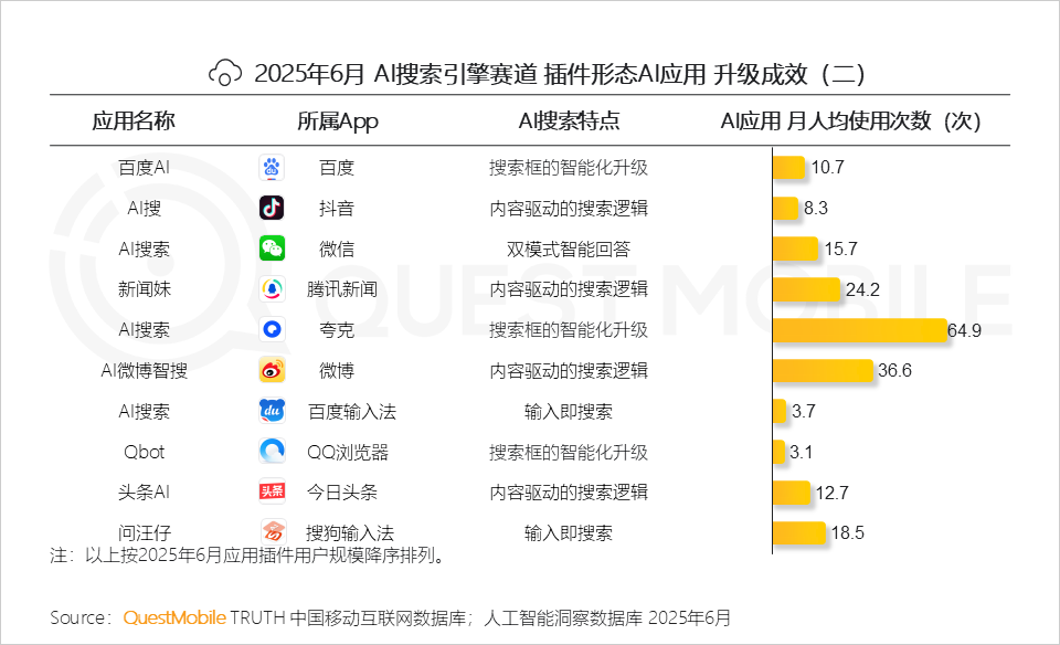 QuestMobile 此次增加了插件市场情况,比如在百度搜索时用到了 AI 摘要就算一个活跃,这种功能化的场景,还有 5000 万的增量用户;