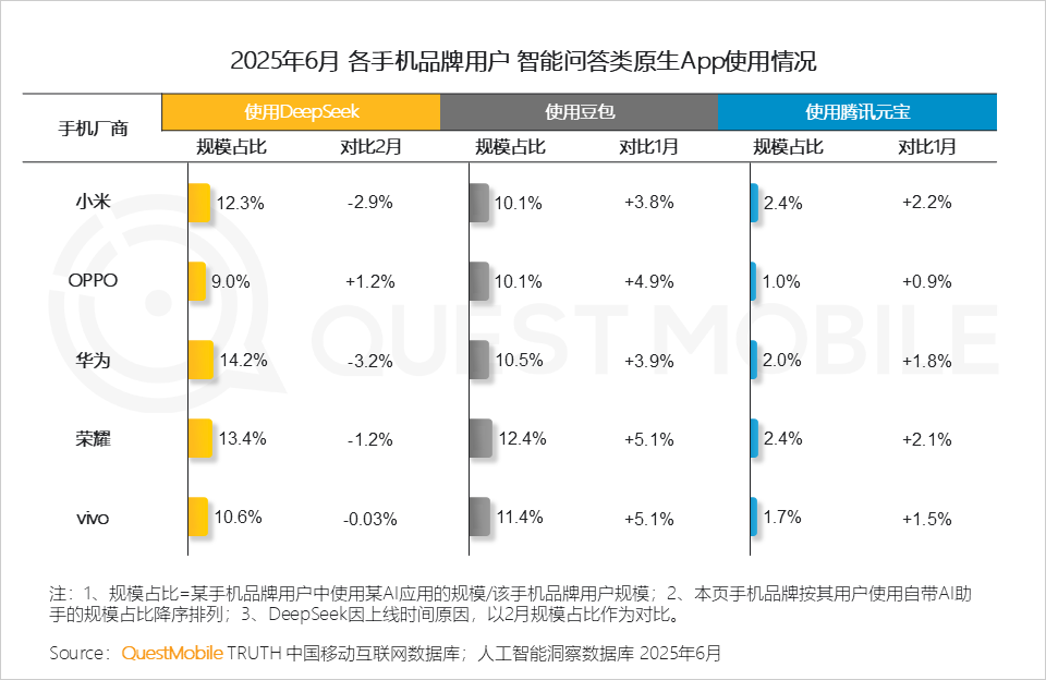 3、QuestMobile数据显示,DeepSeek和豆包在不同手机品牌用户中渗透率突破10%;豆包的多模态创作+多垂类场景覆盖可能会分流手机厂商的AI助手对用户的“吸引力”。(智能问答方面)