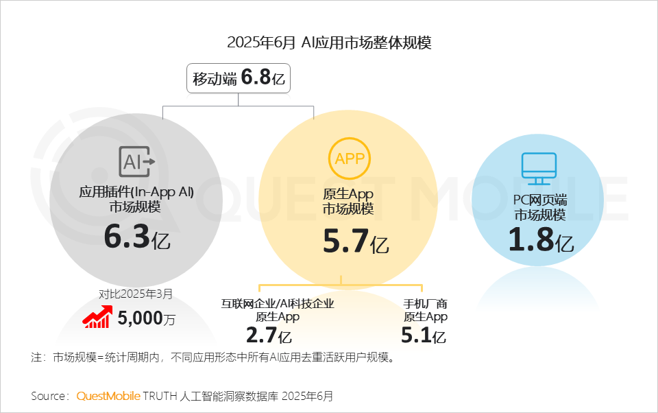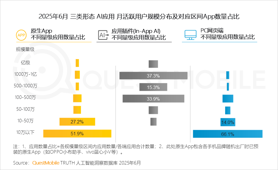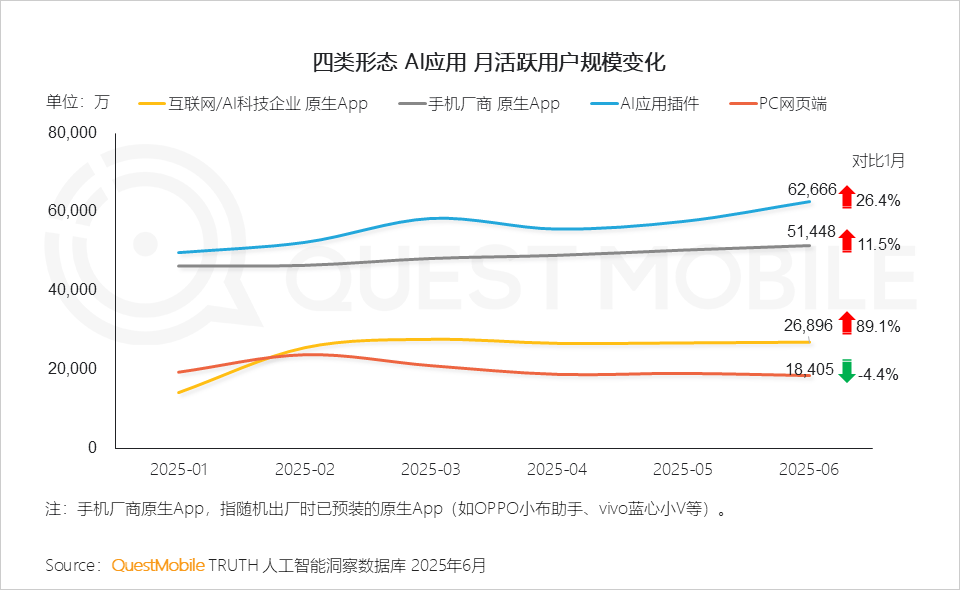 四大梯队应用的表现,落到应用模式上,形成三大类型模式的此消彼长态势。截止到 2025 年 6 月,“移动端-应用插件(In-App AI)”用户规模 6.3 亿,“移动端-原生 App”用户规模为 5.7 亿,“PC 网页应用”用户规模为 1.8 亿,相比 3 月份变化分别为增长 0.5 亿、下降 0.2 亿、下降 0.3 亿。