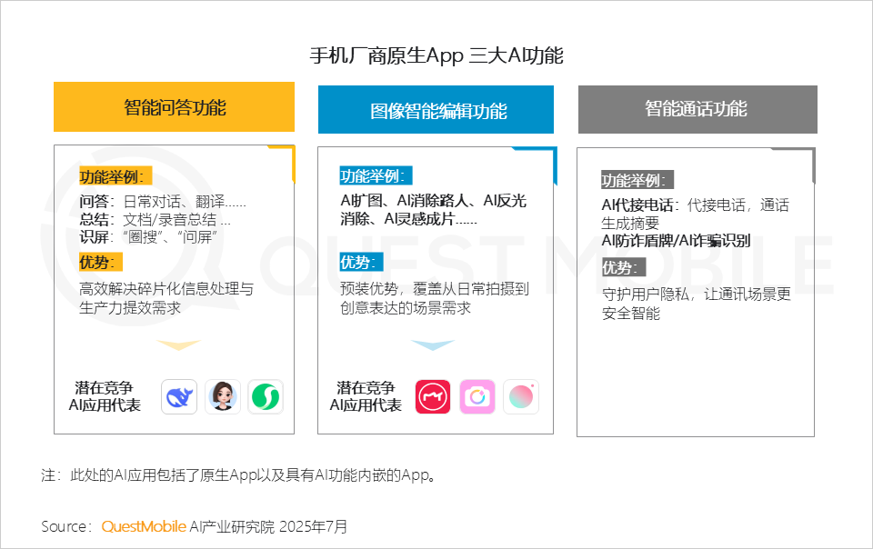 2、目前手机厂商原生App的AI功能围绕智能问答、图像编辑和通话三大场景;其中,问答和图像场景均有AI应用布局,且不乏头部原生App及图片美化行业老牌玩家。