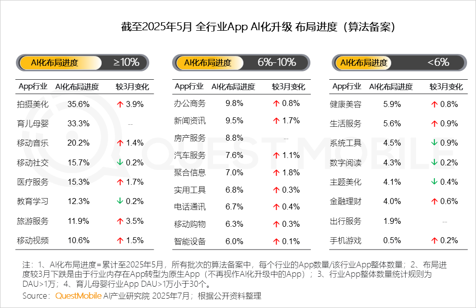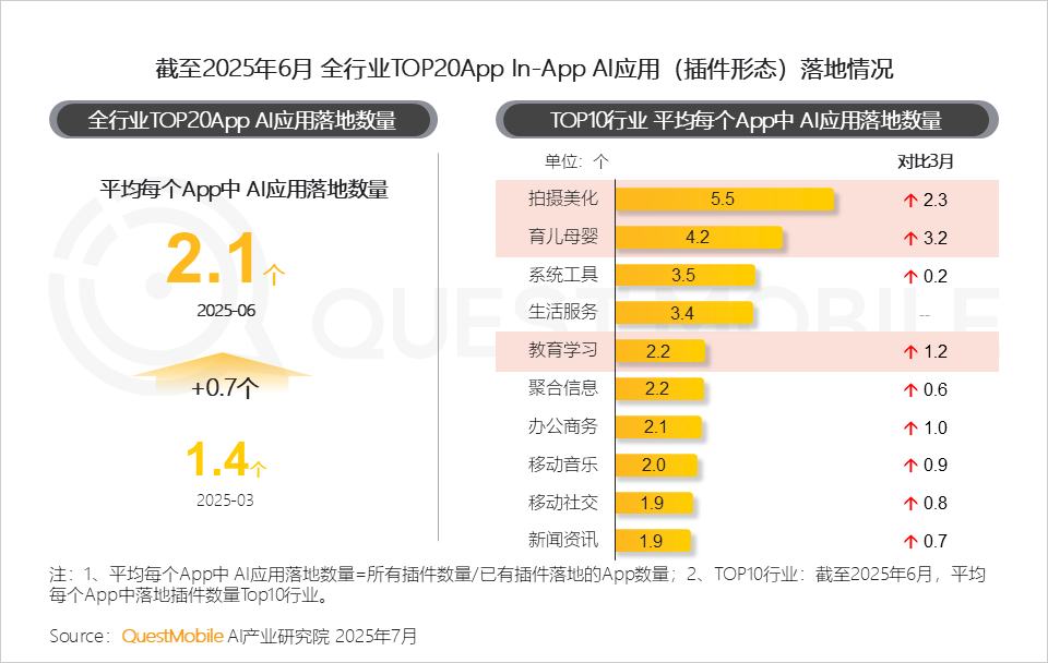 QuestMobile数据显示,平均每个拍摄美化类App中有5.5个AI功能落地,育儿母婴类App中有4.2个。