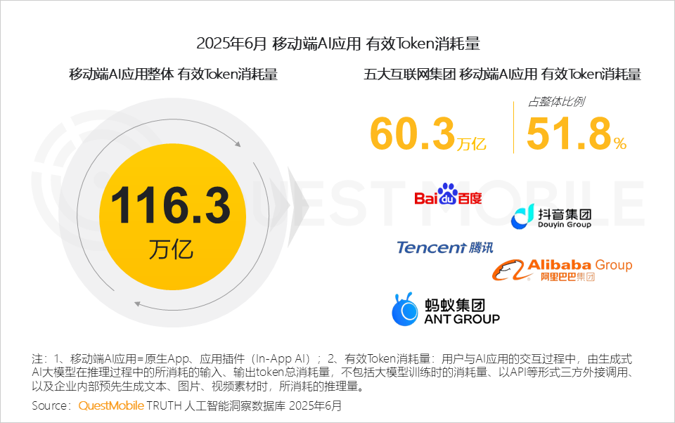 5、与移动端6.8亿用户规模对应的是,有效Token消耗量上升至116.3万亿,其中五大互联网集团占总消耗量的51.8%,达60.3万亿。