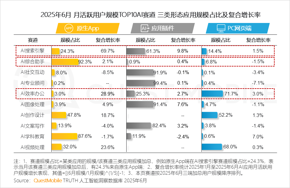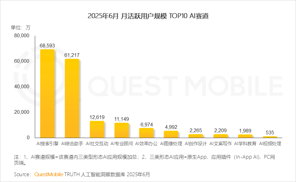 QuestMobile数据显示,2025年6月,AI搜索及AI综合助手赛道规模分别为6.9亿和6.1亿;此外,去年大热门的AI社交赛道,自今年2月起面临一定增长挑战。