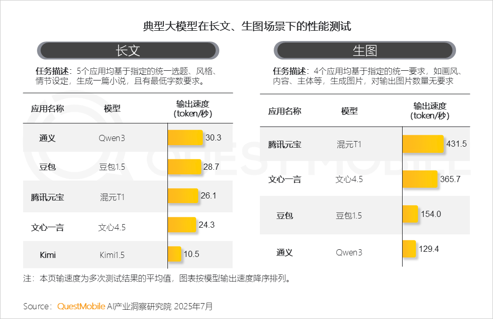 本次参与测试的模型中,腾讯旗下混元T1模型在生图方面表现更具竞争力;值得注意的是,kimi1.5模型在长文上输出速度较慢,或一定程度上解释了其近期流量下滑原因。