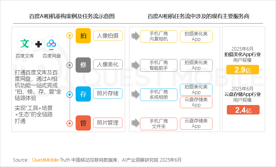 场景选择上,百度以拍摄为任务起点,以照片智能化管理为任务终点,前后两端均为亿级规模大场景。QuestMobile数据显示,2025年6月,拍摄美化行业和云盘存储行业规模分别达2.9亿和2.4亿。