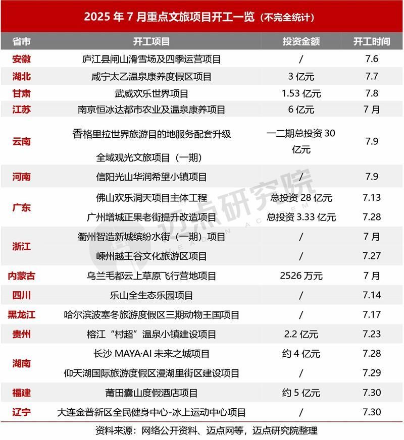 据迈点研究院不完全统计,2025年7月开工项目共18个,分布于安徽、湖北、浙江等15个省(自治区/直辖市);开工项目类型覆盖滑雪、温泉康养与度假、服务配套、街区改造、度假酒店、营地等。其中,投资金额超20亿元的包括两个:佛山欢乐洞天乐园项目主体工程、香格里拉世界旅游目的地服务配套升级全域观光文旅项目,前者为广东省和佛山市重点项目,其建设将有效填补佛山溶洞漂流文旅的空白。