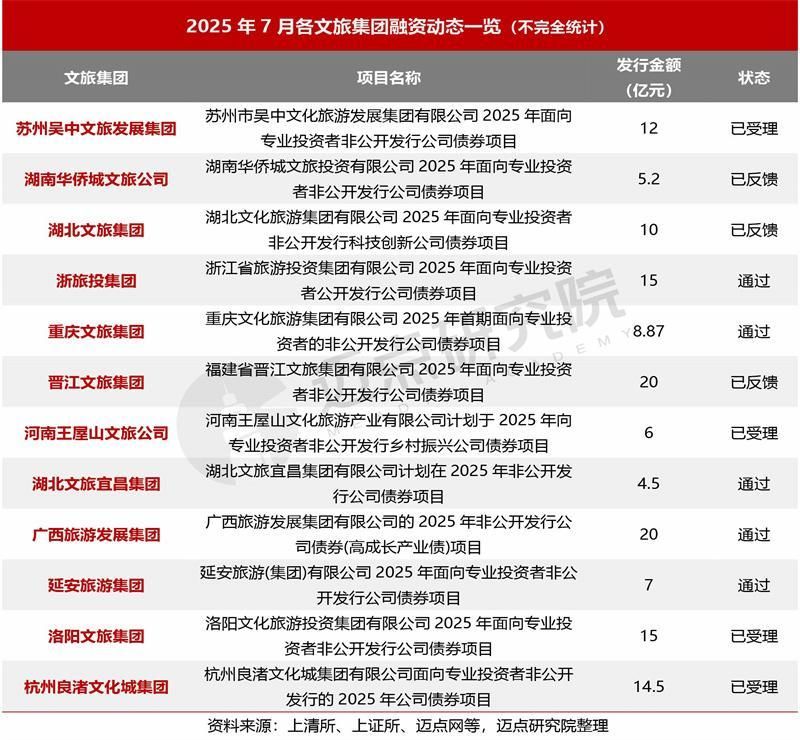 7月,以苏州吴中文旅发展集团、湖北文旅集团等为代表的12家文旅集团积极推进融资项目,各文旅集团融资动作频繁。融资工具方面,以私募债为主导,涉及融资金额合计138.07亿元,利于保障各集团的文旅项目建设、业务布局、偿还债务等资金使用需求。