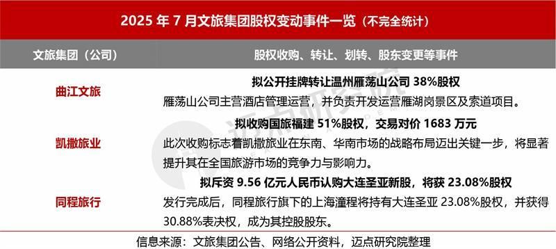 7月,主要有3起股权变动事件值得行业关注:曲江文旅挂牌转让温州雁荡山公司38%的股权、凯撒旅业拟收购国旅福建51%股权、同程旅行拟斥资9.56亿元人民币认购大连圣亚新股,这些变动体现文旅企业通过股权操作调整布局、拓展市场或强化控制权等,以适应行业竞争与发展。