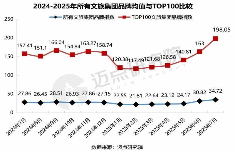 经迈点研究院监测数据显示,2025年7月,所有文旅集团的品牌指数值为34.72,同比上升24.62%,环比上升12.65%;TOP100文旅集团品牌指数值为198.05,同比增长25.82%,环比则增长21.50%。可见,在暑期旅游需求释放、旅游消费补贴刺激、数字化营销与推广的强化等多重利好因素作用下,7月文旅集团整体的品牌指数值均有明显抬升。但TOP100 文旅集团品牌指数(198.05)与所有文旅集团品牌指数(34.72)之间存在巨大差距,反映出文旅市场头部效应明显,中小文旅集团在品牌建设、资源整合、市场竞争力等方面仍面临较大挑战。