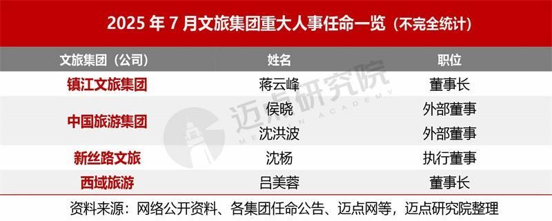 据不完全统计,2025年7月,涉及4家文旅集团重大人事任命,包括董事长、外部董事、执行董事等关键岗位调整,这些岗位对于企业的战略规划、运营决策以及资源调配等方面起着核心主导作用,表明上述人事变动为企业高层架构的调整,对企业未来发展方向影响深远。例如,西域旅游的新任董事长吕美蓉,其在企业管理和战略发展方面具有丰富经验,有望推动公司在市场竞争中稳步发展。