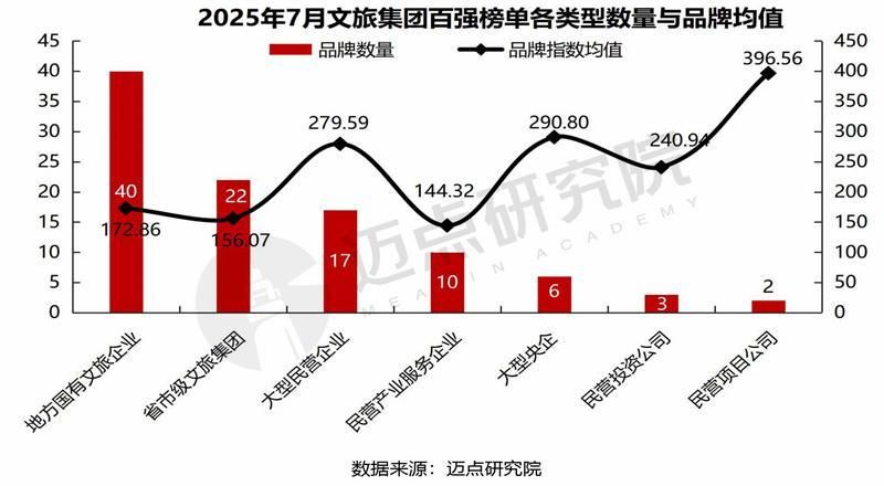 品牌指数均值维度:7月,民营项目公司指数值396.56,位列各类型首位,主要因大连圣亚的品牌助推与提升;其次为大型央企(290.80)和大型民营企业(279.59),重视品牌建设与营销推广工作,知名度与影响力相对领先;地方国有文旅企业(172.86)、省市级文旅集团(156.07),其品牌体系与传播有待强化。