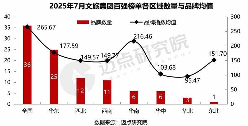 7月百强文旅集团中,依然是全国性文旅集团以36家数量、265.67指数均值领跑;华东地区25家,紧随其后,但其品牌指数均值(177.59)则逊于华南(216.46);西北区域12家,环比上月增加3家、指数值环比增长12.45%,本月西北避暑游市场旺盛,新疆、青海、甘肃等西北省份热度一路高涨;西南地区11家,数量与上月增1家、品牌指数均值环比增长约7%,稳中有升;华中地区6家、指数均值103.68,以湖北文旅集团、张旅集团等为引领;华北地区百强文旅集团3家、指数均值95.47,数量与上月持平、指数值略有下降,有待持续提升;东北区域新晋百强文旅集团1家即长春文旅集团。