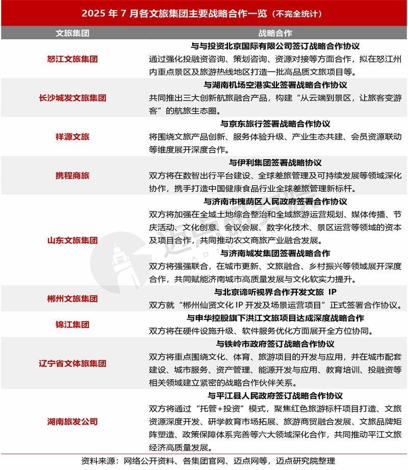 据不完全统计,2025年7月,文旅集团战略合作呈现主体多样、领域广泛的特点,涉及多家文旅集团与投资公司、航空公司、电商平台、乳业公司、地方政府等不同主体,在项目打造、文旅融合、产品服务升级、区域运营、投融资等方面展开合作;这些合作利于凸显资源整合优势,创新文旅发展模式,并有助于提升品牌影响力和促进产业升级,但也面临合作协同缓慢、项目落地推进难等潜在挑战。